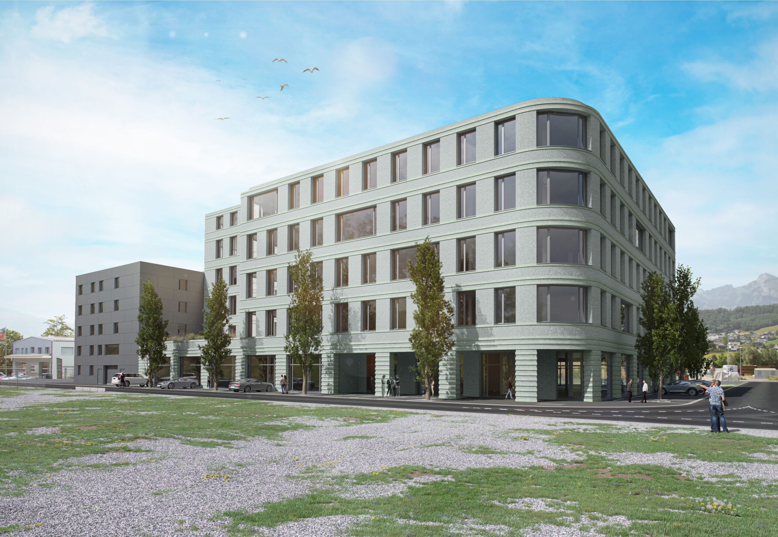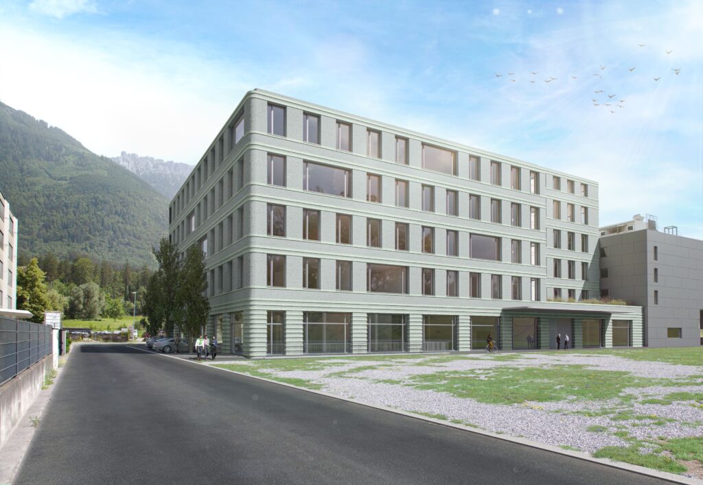 Das Gebäude setzt einen neuen, markanten Akzent im aufstrebenden Industriegebiet von Mauren. Die moderne Fassade aus leicht grünlich schimmerndem Sichtbeton wirkt besonders ansprechend und passt sich harmonisch in die alpine Landschaft ein.